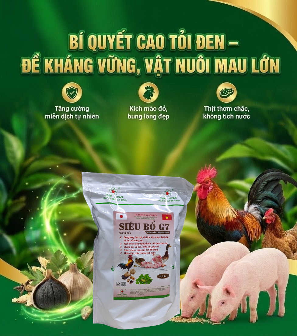 SIÊU BỔ G7 là dòng cốm thảo dược siêu tan, được nghiên cứu và sản xuất theo tiêu chuẩn công nghệ của SUMI – JAPAN PHARMA. Sản phẩm cung cấp nguồn dinh dưỡng thiết yếu cho vật nuôi trong suốt quá trình chăn nuôi.