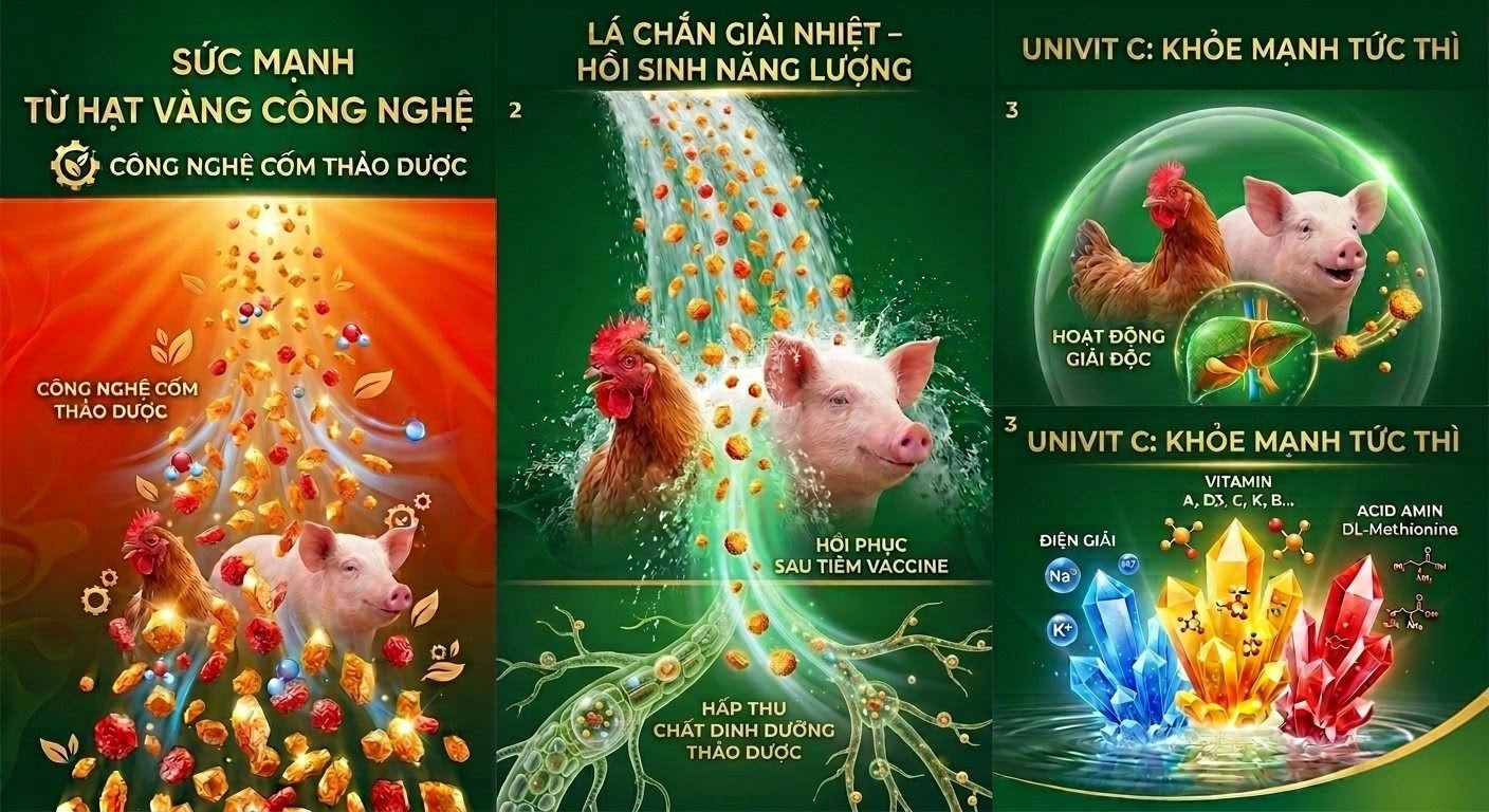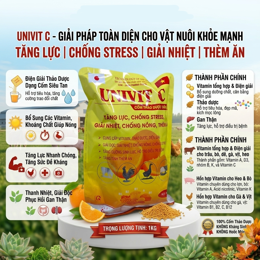 Trong chăn nuôi quy mô lớn, stress nhiệt và mất cân bằng điện giải là nguyên nhân hàng đầu gây hao hụt đàn. UNIVIT C được nghiên cứu dựa trên công nghệ Nhật Bản nhằm bảo vệ vật nuôi toàn diện.